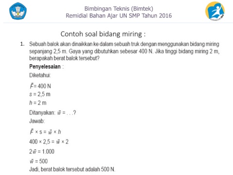Bimbingan Teknis (Bimtek) Remidial Bahan Ajar UN SMP Tahun 2016 Contoh soal bidang miring : 1.