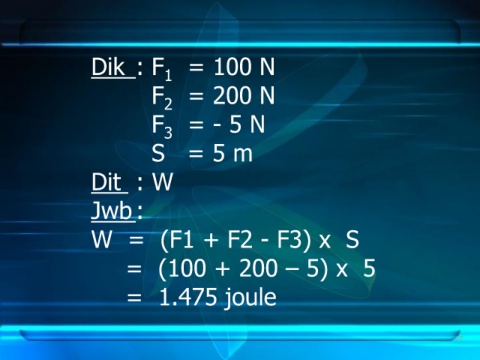 Dik : F = 100 N 1 F = 200 N 2 F = - 5 N 3 S = 5 m Dit : W Jwb : W = (F1 + F2 - F3) x S = (100 + 200 – 5) x 5 = 1.475 joule 27