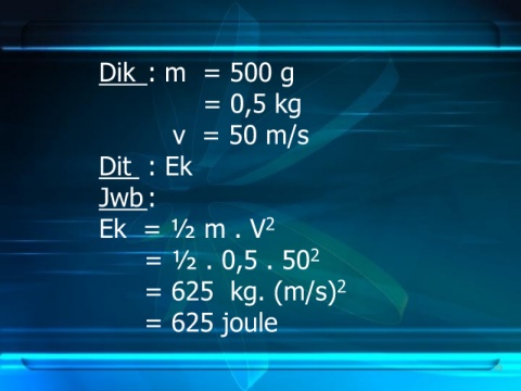 Dik : m = 500 g = 0,5 kg v = 50 m/s Dit : Ek Jwb : Ek = ½ m . V 2 = ½ . 0,5 . 50 2 = 625 kg. (m/s) 2 = 625 joule 29
