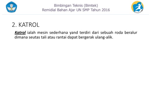 Bimbingan Teknis (Bimtek) Remidial Bahan Ajar UN SMP Tahun 2016 2. KATROL Katrol ialah mesin sederhana yand terdiri dari sebuah roda beralur dimana seutas tali atau rantai dapat bergerak ulang-alik.