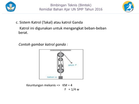 Bimbingan Teknis (Bimtek) Remidial Bahan Ajar UN SMP Tahun 2016 c. Sistem Katrol (Takal) atau katrol Ganda Katrol ini digunakan untuk mengangkat beban-beban berat. Contoh gambar katrol ganda : Keuntungan mekanis => KM = 4 F = 1/4 w