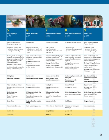 GoALS • say what classroom objects • talk about my clothes • say what I do on different days • name household objects • talk about when I do things • talk about how people feel • describe animals • talk about where people work • say what I like to eat
