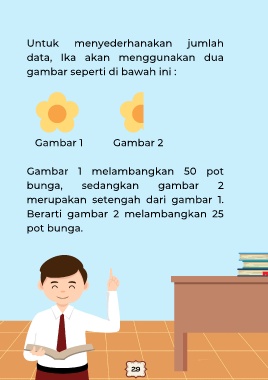Untuk menyederhanakan jumlah data, Ika akan menggunakan dua gambar seperti di bawah ini : Gambar 1 Gambar 2 Gambar 1 melambangkan 50 pot bunga, sedangkan gambar 2 merupakan setengah dari gambar 1. Berarti gambar 2 melambangkan 25 pot bunga. 29