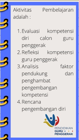Aktivitas Pembelajaran adalah : 1. Evaluasi kompetensi diri calon guru penggerak 2. Refleksi kompetensi guru penggerak 3. Analisis faktor pendukung dan penghambat pengembangan kompetensi 4. Rencana pengembangan diri