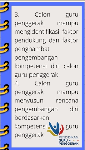 3. Calon guru penggerak mampu mengidentifikasi faktor pendukung dan faktor penghambat pengembangan kompetensi diri calon guru penggerak 4. Calon guru penggerak mampu menyusun rencana pengembangan diri berdasarkan kompetensi guru penggerak