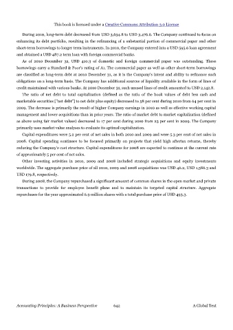 During 2010, long-term debt decreased from USD 3,634.8 to USD 3,476.6. The Company continued to focus on