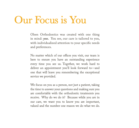 Olsen Orthodontics was created with one thing in mind: you. You see, our care is tailored to you, with individualized attention to your specific needs and preferences.