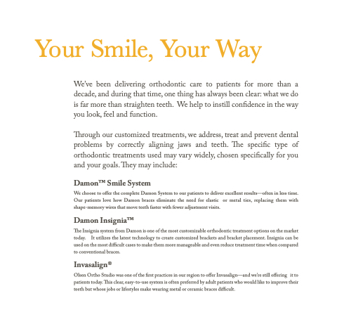 Olsen Ortho Studio was one of the first practices in our region to offer Invasalign—and we’re still offering it to patients today. This clear, easy-to-use system is often preferred by adult patients who would like to improve their teeth but whose jobs or lifestyles make wearing metal or ceramic braces difficult.