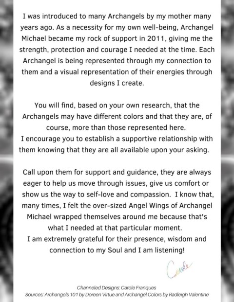 Sources: Archangels 101 by Doreen Virtue and Archangel Colors by Radleigh Valentine