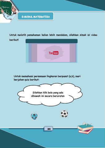 E-MODUL MATEMATIKA Untuk melatih pemahaman kalian lebih mendalam, silahkan simak isi video berikut! Untuk memahami persamaan lingkaran berpusat (a,b), mari kerjakan quiz berikut: Silahkan klik bola yang ada dibawah ini secara berurutan 4 3