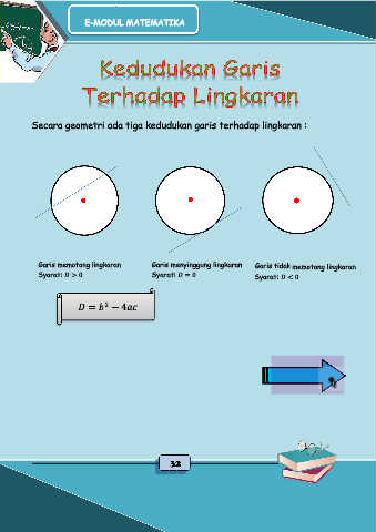 E-MODUL MATEMATIKA Secara geometri ada tiga kedudukan garis terhadap lingkaran : Garis memotong lingkaran Garis menyinggung lingkaran Garis tidak memotong lingkaran Syarat: > 0 Syarat: = 0 Syarat: < 0 = − 4 2