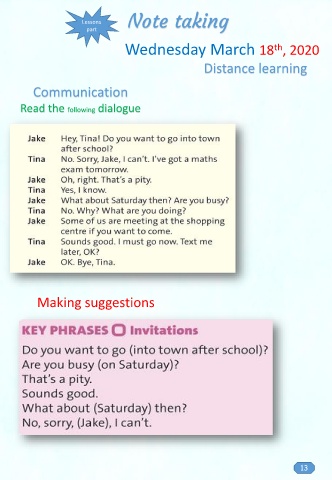 Note taking Lessons part th Wednesday March 18 , 2020 Distance learning Communication Read the following dialogue Making suggestions 13