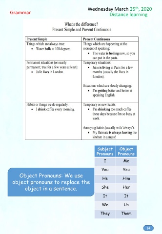 th Wednesday March 25 , 2020 Grammar Distance learning Subject Object Pronouns Pronouns I Me You You Object Pronouns: We use He Him object pronouns to replace the object in a sentence. She Her It It We Us They Them 14