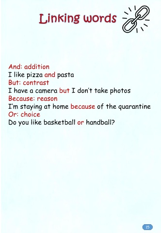 And: addition I like pizza and pasta But: contrast I have a camera but I don’t take photos Because: reason I’m staying at home because of the quarantine Or: choice Do you like basketball or handball? 15