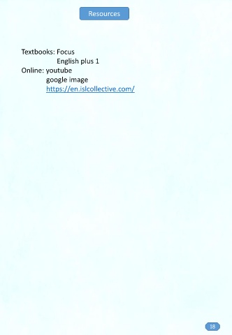 Resources Textbooks: Focus English plus 1 Online: youtube google image https://en.islcollective.com/ 18