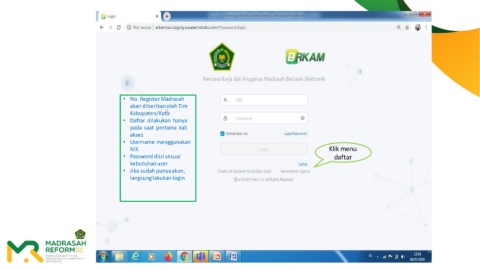 • No. RegisterMadrasah akan diberikanolehTim Kabupaten/Kota • Daftar dilakukan hanya pada saat pertama kali akses • Username menggunakan NIK Klik menu • Password diisi sesuai daftar kebutuhanuser • Jika sudah punyaakun, langsunglakukan login