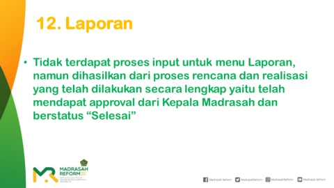 12. Laporan • Tidak terdapat proses input untuk menu Laporan, namun dihasilkan dari proses rencana dan realisasi yang telah dilakukan secara lengkap yaitu telah mendapat approval dari Kepala Madrasah dan berstatus “Selesai”