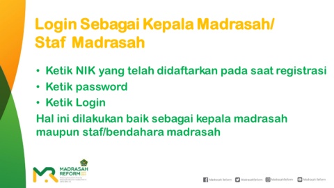 Login Sebagai Kepala Madrasah/ Staf Madrasah • Ketik NIK yang telah didaftarkan pada saat registrasi • Ketik password • Ketik Login Hal ini dilakukan baik sebagai kepala madrasah maupun staf/bendahara madrasah