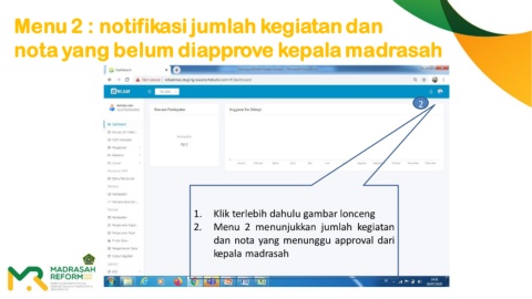Menu 2 : notifikasi jumlah kegiatan dan nota yang belum diapprove kepala madrasah 2 1. Klik terlebih dahulu gambar lonceng 2. Menu 2 menunjukkan jumlah kegiatan dan nota yang menunggu approval dari kepala madrasah