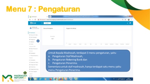 Menu 7 : Pengaturan 7 Untuk Kepala Madrasah,terdapat3 menu pengaturan, yaitu a. Pengaturan StafMadrasah, b. Pengaturan RekeningBankdan c. Pengaturan Penerima. Sementarauntuk stafmadrasah,hanya terdapatsatu menu yaitu menu PengaturanPenerima.