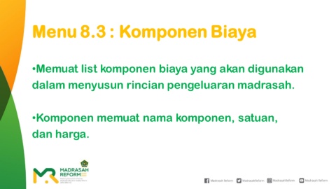 Menu 8.3 : Komponen Biaya •Memuat list komponen biaya yang akan digunakan dalam menyusun rincian pengeluaran madrasah. •Komponen memuat nama komponen, satuan, dan harga.