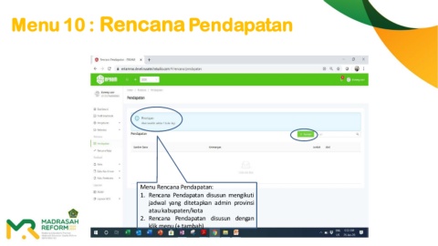 Menu 10 : Rencana Pendapatan Menu Rencana Pendapatan: 1. Rencana Pendapatan disusun mengikuti jadwal yang ditetapkan admin provinsi ataukabupaten/kota 2. Rencana Pendapatan disusun dengan klik menu (+ tambah)