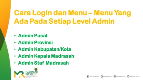 Cara Login dan Menu – Menu Yang Ada Pada Setiap Level Admin • Admin Pusat • Admin Provinsi • Admin Kabupaten/Kota • Admin Kepala Madrasah • Admin Staf Madrasah