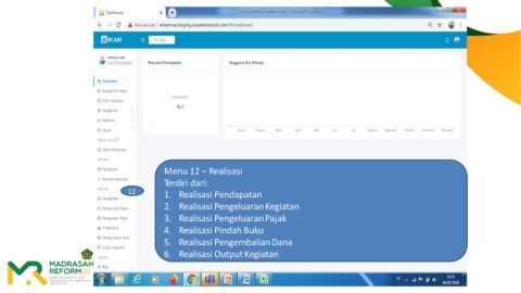 Menu 12 – Realisasi Terdiri dari: 12 1. Realisasi Pendapatan 2. Realisasi PengeluaranKegiatan 3. Realisasi PengeluaranPajak 4. Realisasi Pindah Buku 5. Realisasi PengembalianDana 6. Realisasi OutputKegiatan