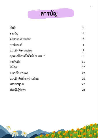 สารบญ ั คํานํา ก ข ั สารบญ ุ ิ จดประสงครายวชา ค จดประสงค ง ุ ี ั แบบฝกหดกอนเรยน 1 คณสมบตสารกงตวนํา N และ P ิ 2 ั ั ึ่ ุ ั การไบอส 31 ไดโอด 37 ี วงจรเรยงกระแส 49 แบบฝกหดทายหนวยเรยน 76 ี ั บรรณานกรม 77 ุ ิ ั ั ประวตผจดทํา 78 ู