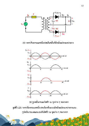 (ก) วงจรเรียงกระแสหนึ่งเฟสเต็มคลื่นที่มีหมอแปลงแทปกลาง (ข) รูปคลื่นกระแสไฟฟา ณ จุดตาง ๆ ของวงจร รูปที่ 1.21 วงจรเรียงกระแสหนึ่งเฟสเต็มคลื่นแบบมีหมอแปลงแทปกลางและ รูปคลื่นกระแสและแรงดันไฟฟา ณ จุดตาง ๆ ของวงจร