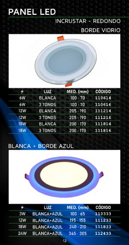 PANEL LED INCRUSTAR - REDONDO BORDE VIDRIO 110614 110616 111214 111216 111814 111816 BLANCA + BORDE AZUL 110333 111233 111833 112433 12