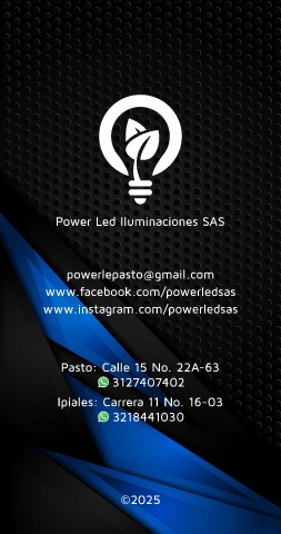 Power Led Iluminaciones SAS powerlepasto@gmail.com www.facebook.com/powerledsas www.instagram.com/powerledsas Pasto: Calle 15 No. 22A-63 3127407402 Ipiales: Carrera 11 No. 16-03 3218441030 ©2025