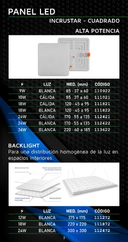 PANEL LED INCRUSTAR - CUADRADO ALTA POTENCIA 110922 111021 111821 111822 112421 112422 113622 BACKLIGHT Para una distribución homogénea de la luz en espacios interiores. 111272 111872 112472 3
