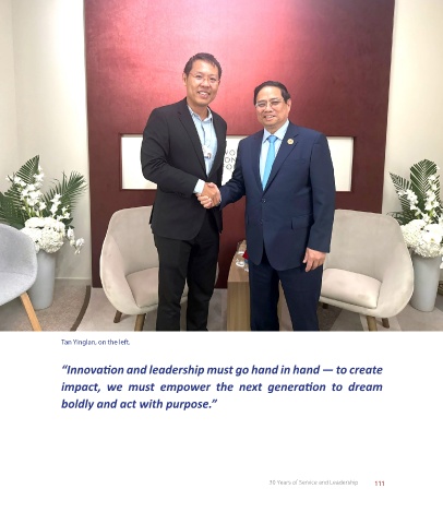Tan Yinglan on the left. Tan Yinglan, on the left. “Innovation and leadership must go hand in hand — to create impact, we must empower the next generation to dream boldly and act with purpose.” 30 Years of Service and Leadership 111