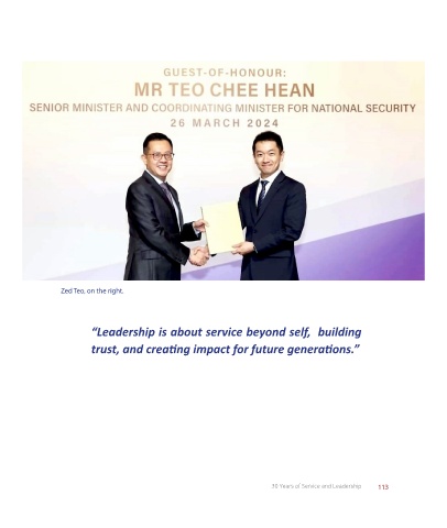 Zed Teo, on the right. “Leadership is about service beyond self, building trust, and creating impact for future generations.” 30 Years of Service and Leadership 113
