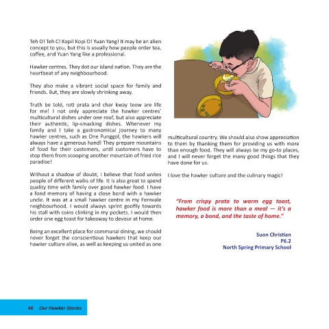 hawker centres, such as One Punggol, the hawkers will  multicultural country. We should also show appreciation