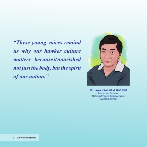 “These young voices remind us why our hawker culture matters - because it nourished not just the body, but the spirit of our nation.” Mr James Soh BBM PBM MBE Executive Director National Youth Achievement Award Council 2 Our Hawker Stories
