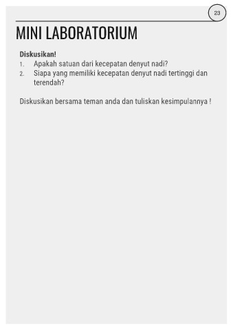 23 MINI LABORATORIUM Diskusikan! 1. Apakah satuan dari kecepatan denyut nadi? 2. Siapa yang memiliki kecepatan denyut nadi tertinggi dan terendah? Diskusikan bersama teman anda dan tuliskan kesimpulannya !