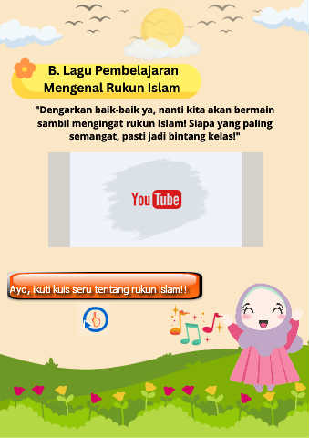 B. Lagu Pembelajaran Mengenal Rukun Islam "Dengarkan baik-baik ya, nanti kita akan bermain sambil mengingat rukun Islam! Siapa yang paling semangat, pasti jadi bintang kelas!"