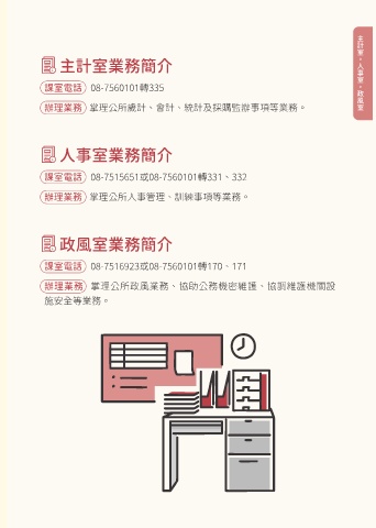 辦理業務 掌理公所政風業務、協助公務機密維護、協調維護機關設