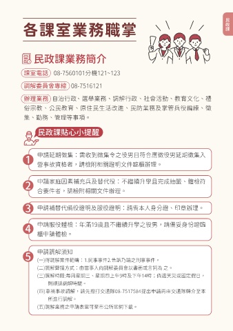 辦理業務 自治行政、選舉業務、調解行政、社會活動、教育文化、禮