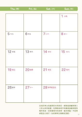 23 初七 24 初八 25 初九 26 初十 27 十一 28 和平紀念日