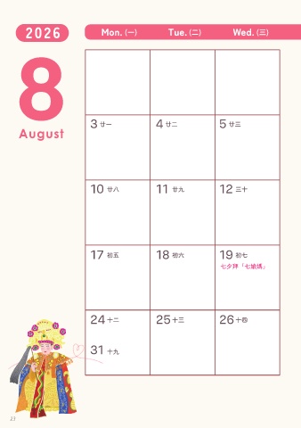 August 3 廿一 4 廿二 5 廿三 6 廿四 7 立秋 8 廿六 9 廿七