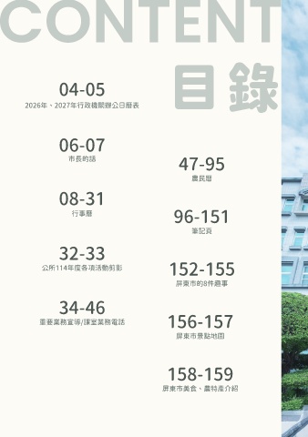 CONTENT 2026年、2027年行政機關辦公日曆表 目錄 04-05 06-07 市長的話 47-95 農民曆 08-31 96-151 行事曆 筆記頁 32-33 152-155 公所114年度各項活動剪影 屏東市的8件趣事 34-46 156-157 重要業務宣導/課室業務電話 屏東市景點地圖 158-159 屏東市美食、農特產介紹