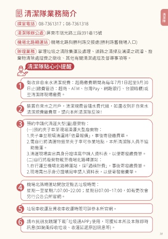 辦理業務 掌理道路、寬頻管道、路面坑洞修補、土石、水利等行政與 棄物清除處理費之徵收、其他有關清潔處理及督導事項等。