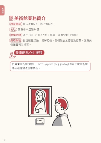 辦理業務 綜理展覽活動、場所租借、美術館志工管理及招募、屏東美 嬰幼兒閱讀室:週二-週日10:00~17:00