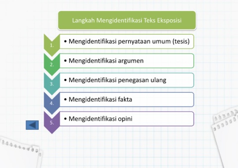 Langkah Mengidentifikasi Teks Eksposisi • Mengidentifikasi pernyataan umum (tesis) 1. • Mengidentifikasi argumen 2. • Mengidentifikasi penegasan ulang 3. • Mengidentifikasi fakta 4. • Mengidentifikasi opini 5.