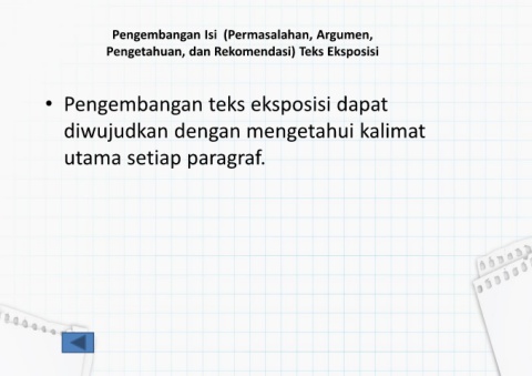 Pengembangan Isi (Permasalahan, Argumen, Pengetahuan, dan Rekomendasi) Teks Eksposisi • Pengembangan teks eksposisi dapat diwujudkan dengan mengetahui kalimat utama setiap paragraf.