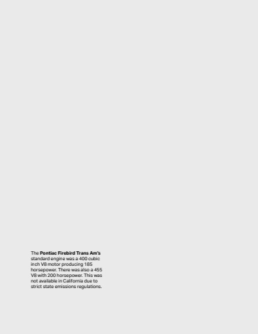 The Pontiac Firebird Trans Am%u2019sstandard engine was a 400 cubic inch V8 motor producing 185 horsepower. There was also a 455 V8 with 200 horsepower. This was not available in California due to strict state emissions regulations.