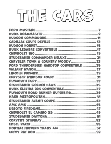 The CarsFord Mustang............................................................7Buick Roadmaster .....................................................9Hudson Commodore................................................. 11Cadillac Coupe Deville............................................ 13Hudson Hornet......................................................... 15Buick LeSabre Convertible ......................................17Chevrolet 150 ........................................................... 19Studebaker Commander Deluxe ............................ 21Chrysler Town & Country Woody........................23Ford Thunderbird Hardtop Convertible .............25Valiant Wagon..........................................................27Lincoln Premier........................................................29Chrysler Windsor Coupe ........................................ 31Plymouth Fury.........................................................33Studebaker Golden Hawk ......................................35Buick Electra 225 Convertible...............................37Plymouth Road Runner Superbird........................39Nash Metropolitan ................................................. 41Studebaker Avanti Coupe........................................43AMC AMX ...................................................................45Desoto Firedome......................................................47Chevrolet El Camino SS .........................................49Studebaker Daytona............................................... 51Corvette Stingray ....................................................53Edsel Pacer...............................................................55Pontiac Firebird Trans Am .................................... 57Chevy Rat Rod ..........................................................59